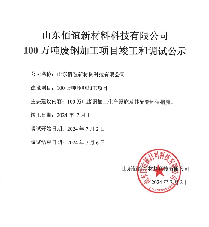 上一篇:山東佰誼新材料科技有限公司150萬噸廢鋼加工項目(一期)環(huán)保設(shè)施竣工、調(diào)試公示